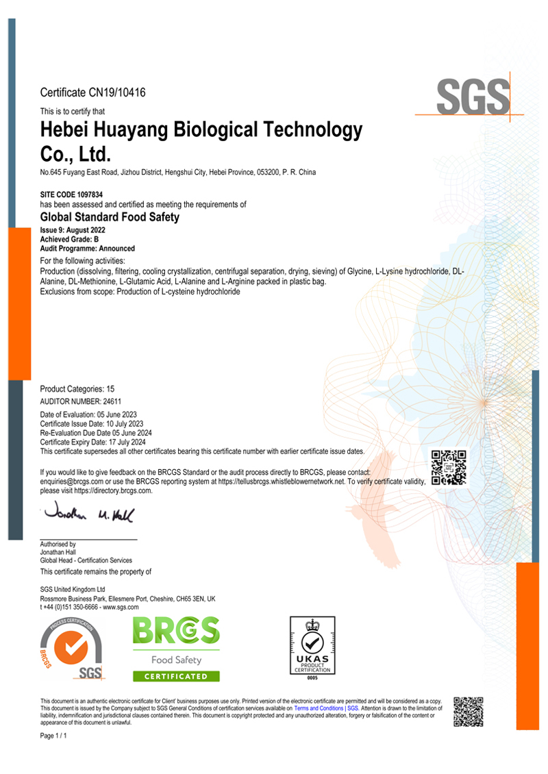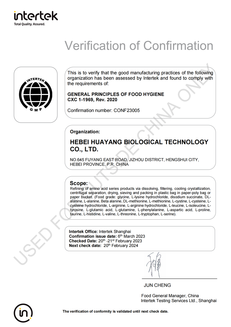 Hebei Huayang Group Co., Ltd. is located in the Provincial Industrial Park of Jizhou District, Hengshui City, Hebei Province (founded in 1987, formerly known as Jizhou Huayang Chemical Co., Ltd.). The group has four companies: Hebei Huayang Biological technology Co., Ltd., Hebei Huayue Amino Acid Technology Co., Ltd., Cangzhou Huachen Biological technology Co., Ltd., and Hengshui Yangli Trading Co., Ltd. Mainly produces industrial, food, amino acid series such as glycine, L-alanine, L-threonine, DL-methionine, L-lysine hydrochloride, L-cysteine hydrochloride, Disodium succinate. Products are widely used in food, beverage, feed industries.